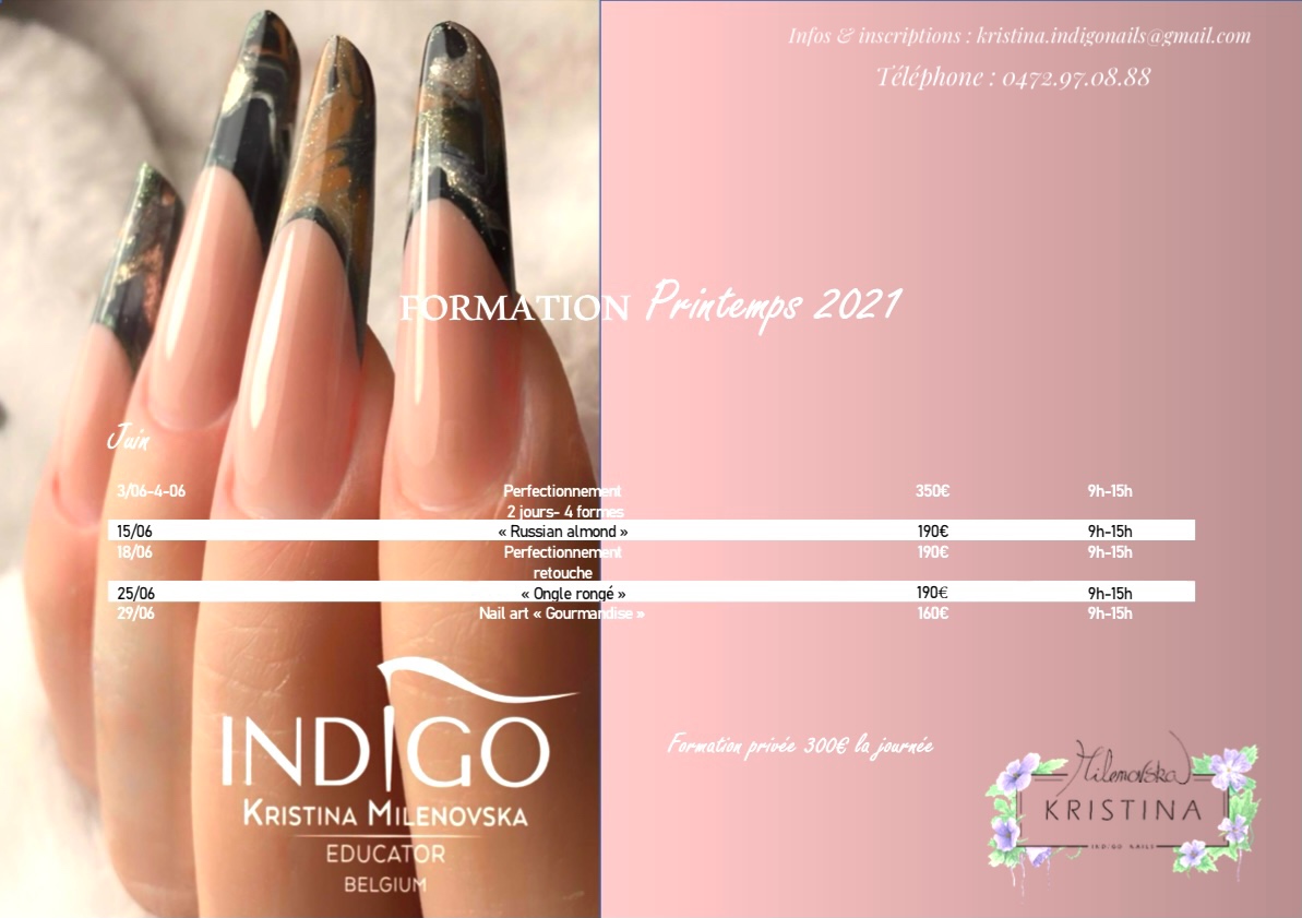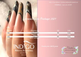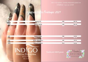 Je suis également formatrice certifié Indigo, je vous propose donc des formations afin de vous aider à vous améliorer dans ce domaine ou tout simplement si vous souhaitez devenir prothésiste ongulaire. Un agenda formation est proposé chaque trimestre. Infos et inscriptions uniquement via kristina.indigonails@gmail.com